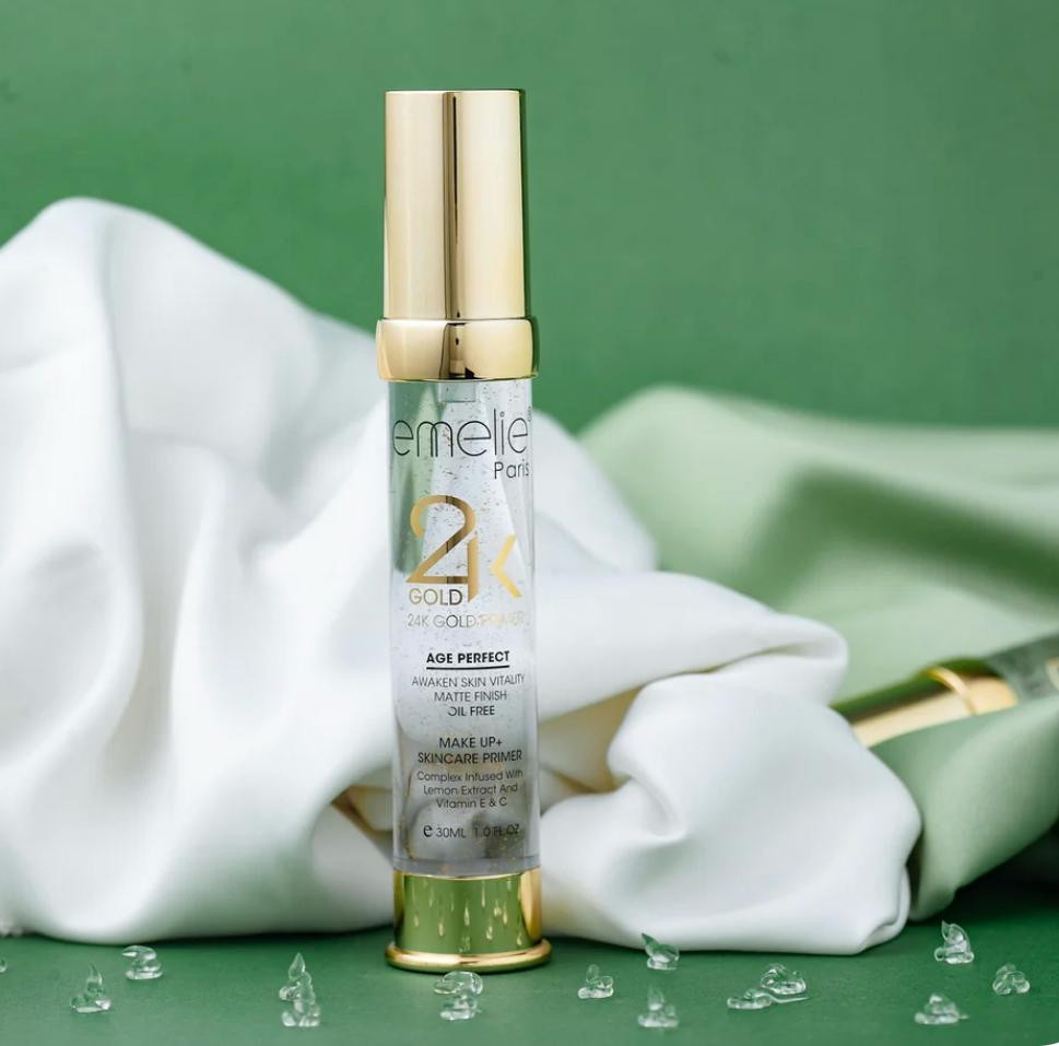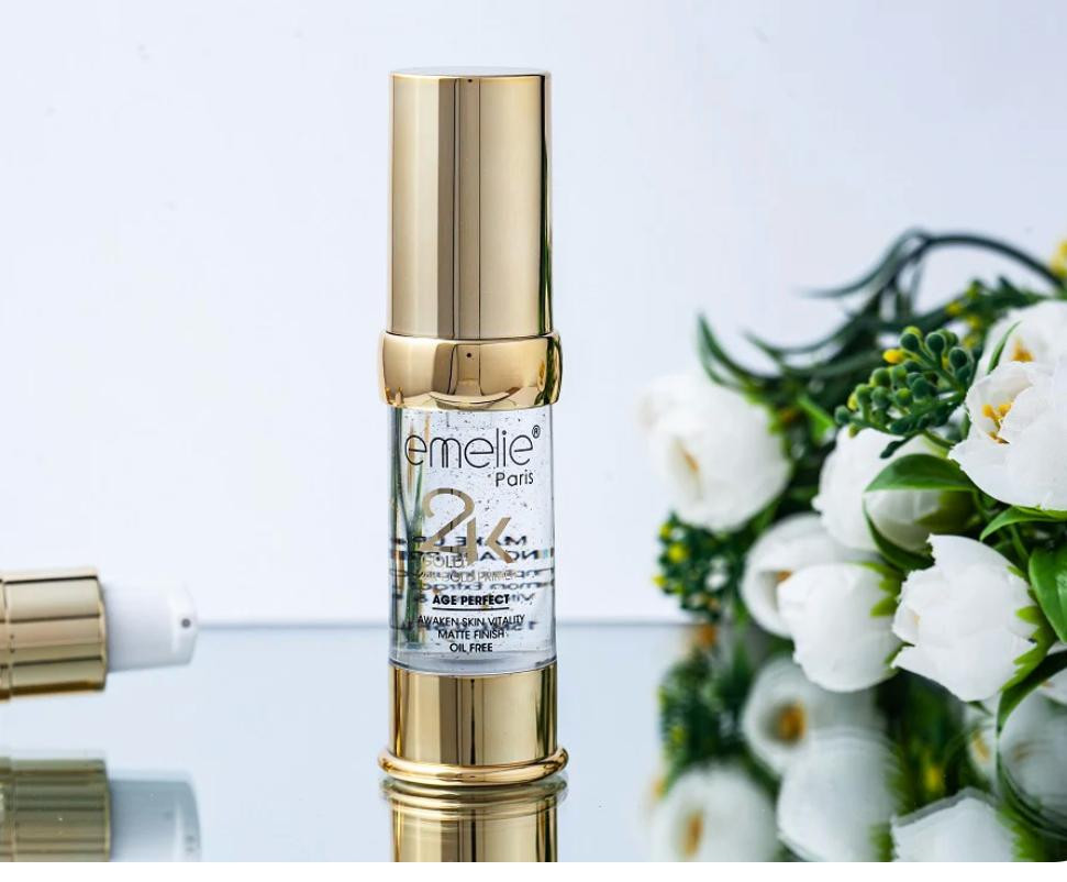 Elevate your makeup game with Emeile 24K Gold Primer, a luxurious primer infused with real 24K gold particles. This lightweight formula smooths and evens your skin, minimizing the appearance of pores and fine lines while providing a radiant, glowing base. Perfect for all skin types, it enhances makeup longevity, giving your foundation a flawless, luminous finish that lasts all day. Indulge in the ultimate blend of skincare and makeup luxury with Emeile 24K Gold Primer.