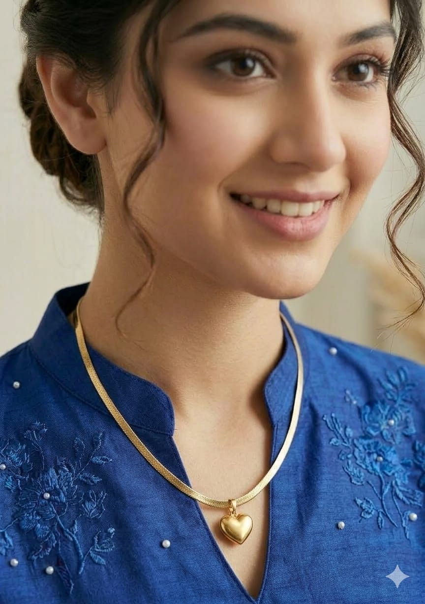 The polished snake chain sits comfortably around the neck and enhances the charm of the heart pendant, making it perfect for everyday wear or special occasions. Its simple yet stylish design pairs beautifully with both casual outfits and formal dresses.
